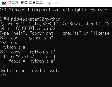 문자열 중 Python's에 작은따옴표(')가 포함되어 있습니다.